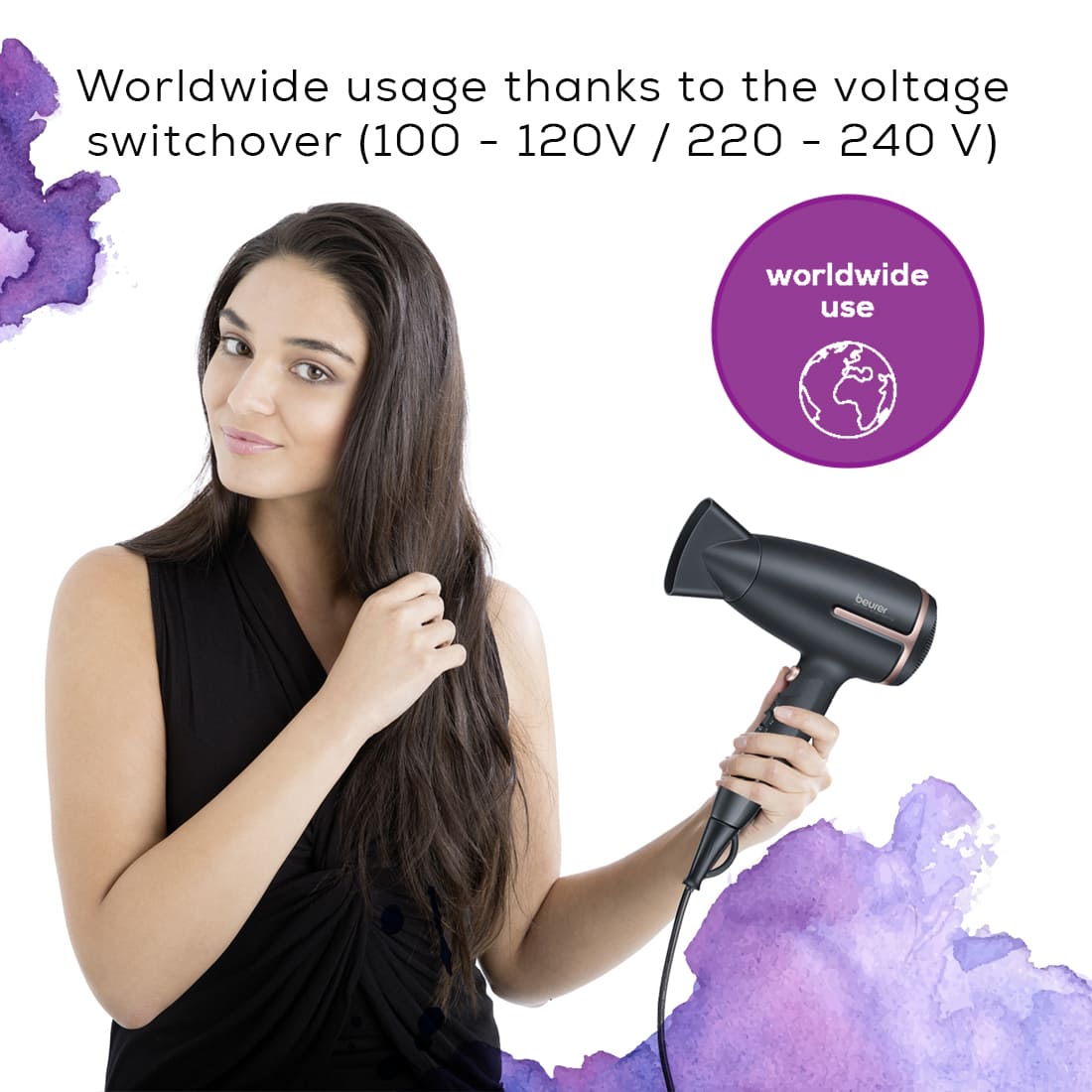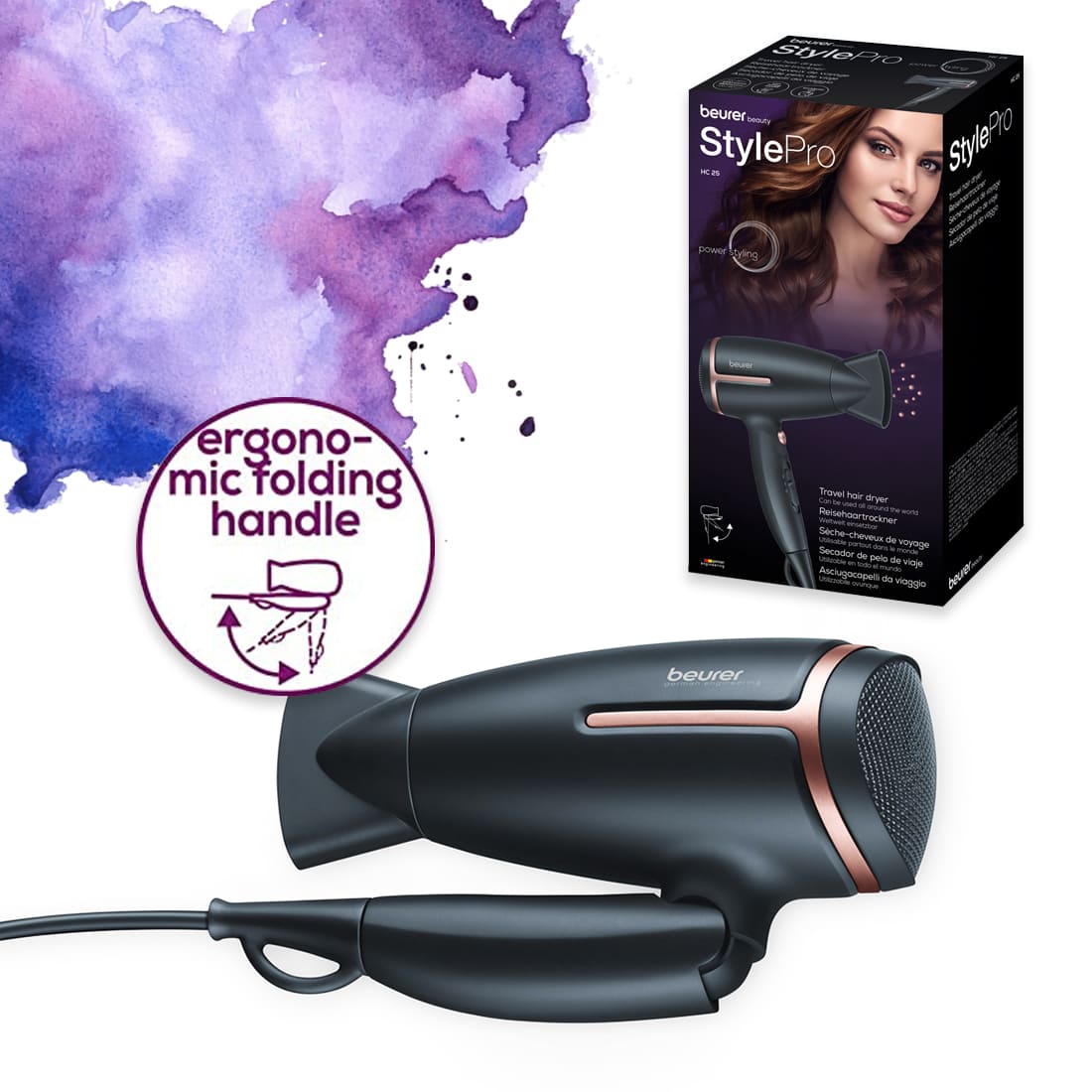 The powerful travel hair dryer is the perfect companion for your holiday it can be used all around the world, the integrated ion function gives your hair extra shine and it takes up little space in your luggage thanks to the folding handle.