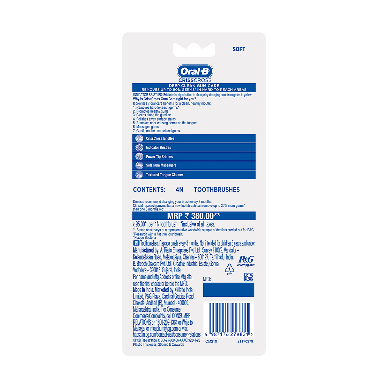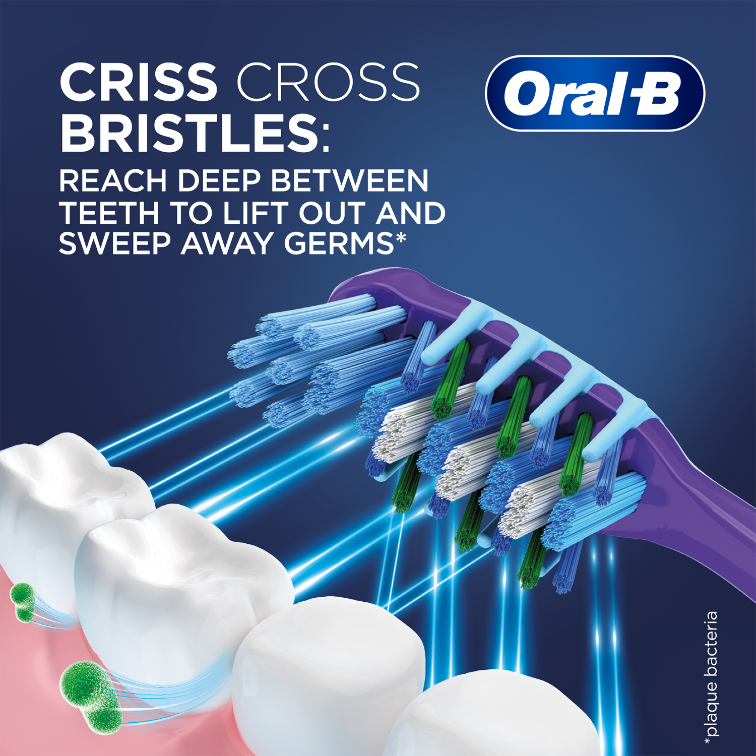 Oral-B is the World’s No. 1 Toothbrush brand used and recommended by dentists worldwide, which brings to you and your family revolutionary brushing solutions with best in class technology to ensure you and your family get healthier and cleaner mouth. Oral-B Criss Cross Gum Care Toothbrush is designed to remove up to 90% germs* in hard-to-reach areas to give you a clean and healthy smile. Extra-long Power Tip bristles hit areas where plaque builds up, and CrissCross bristles flex and straighten to get in-between teeth while still being gentle on your gums.