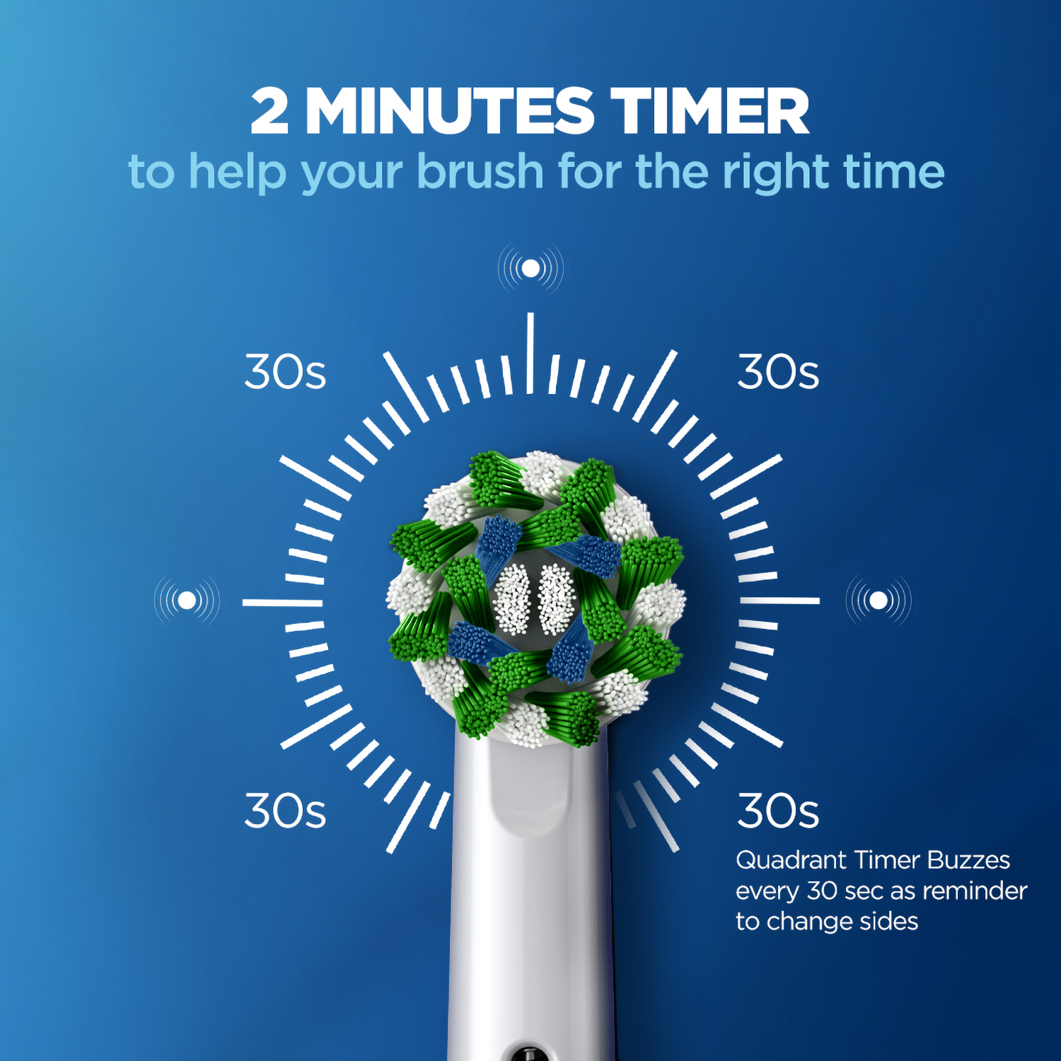 - Vibrates every 30 seconds to alert you to change the area that’s being brushed